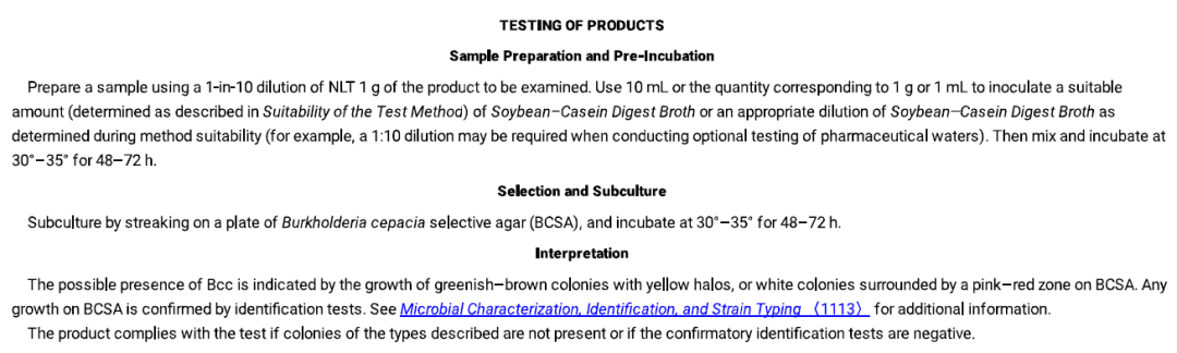 最開(kāi)始,洋蔥伯克霍爾德菌并未被列入USP的控制菌檢查范圍內,它對藥品的潛在威脅性是在2018年9月底舉行的PDA/FDA會(huì )議中被提出。目前,USP<60> MICROBIOLOGICAL EXAMINATION OF NONSTERILE PRODUCTS—TESTS FOR BURKHOLDERIA CEPACIA COMPLEX已于2019年12月1日生效,正式將洋蔥伯克霍爾德復合體納入了USP控制菌檢查項目。