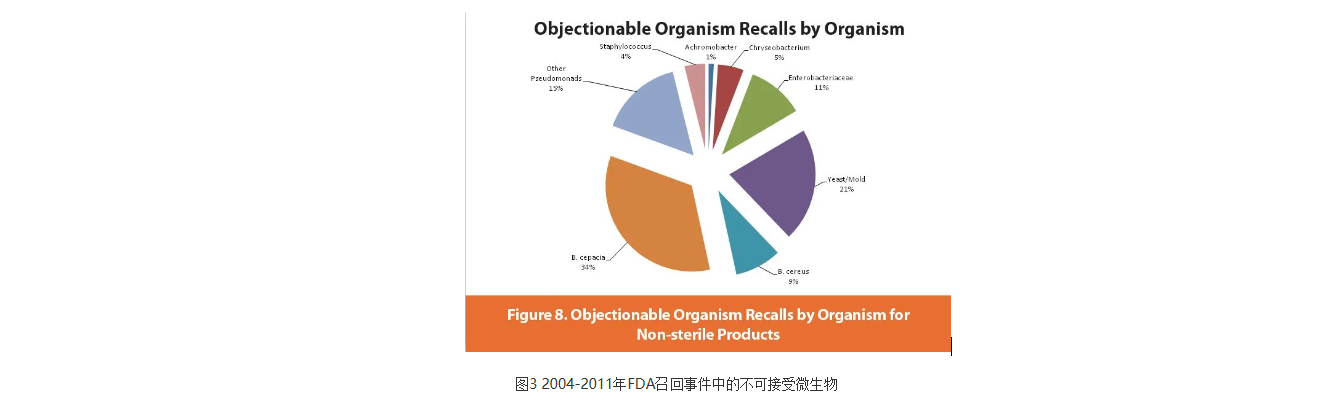 在FDA召回的非無(wú)菌產(chǎn)品中,洋蔥伯克霍爾德菌(B.cepacia)污染是涉及召回次數最多的微生物污染召回事件,在2004-2011年FDA召回事件中的不可接受微生物,占三分之一的污染微生物為洋蔥伯克霍爾德菌(Burkholderia cepacia)。